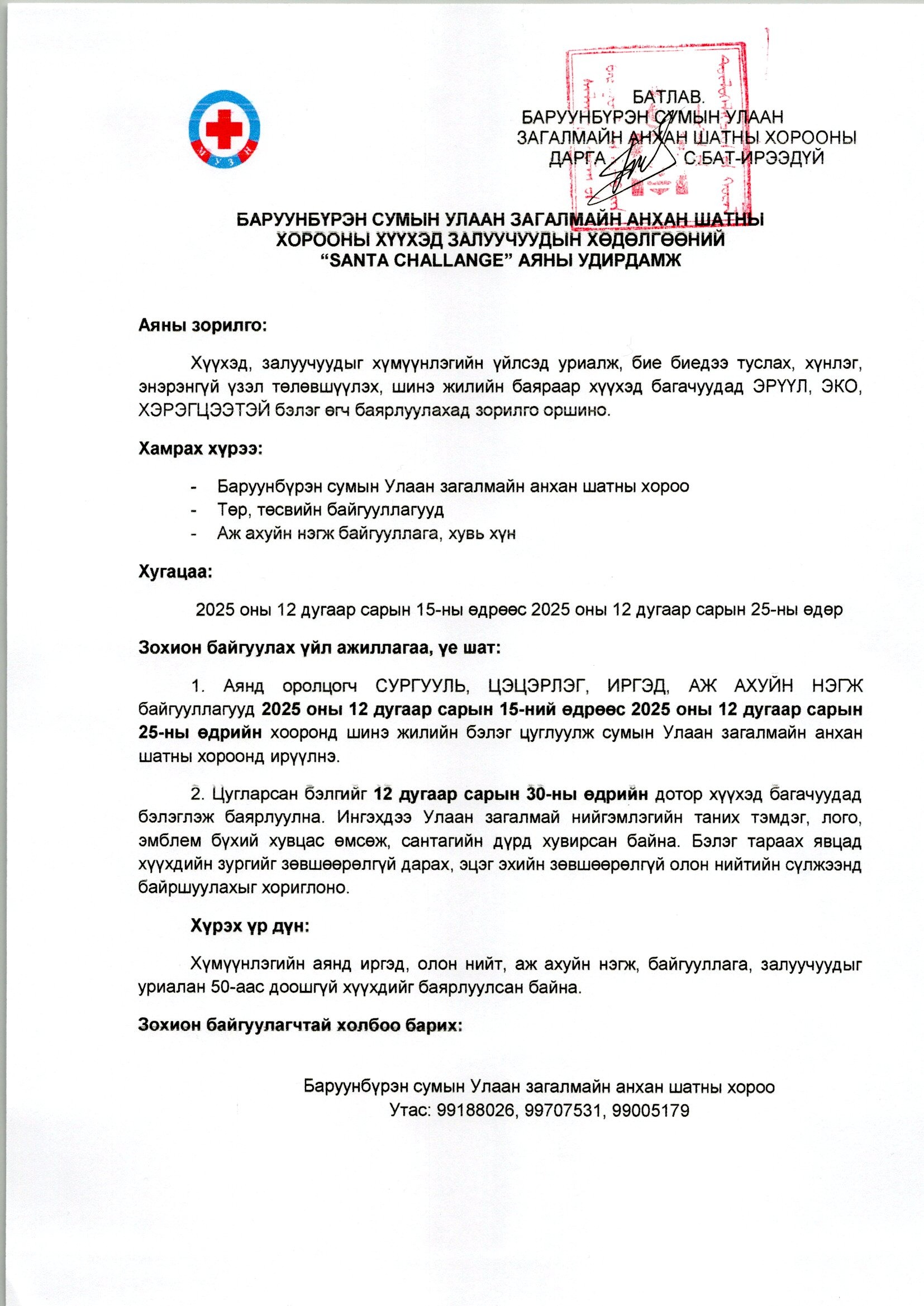 Үндэсний хүмүүнлэгийн байгууллагаас уламжлалт болгон зохион байгуулдаг “SANTA CHALLENGE” бэлэг цуглуулах аянд хүнлэг, энэрэнгүй ИРГЭН / хувь хүн/ бүр, нийгмийн хариуцлагатай ААН, БАЙГУУЛЛАГА бүрийг нэгдэхийг уриалж байна. Та бүхний илгээсэн сэтгэлийн бэлэг нь тусламж шаардлагатай байгаа мянга мянган бяцхан зүрхийг баярлуулах болноо